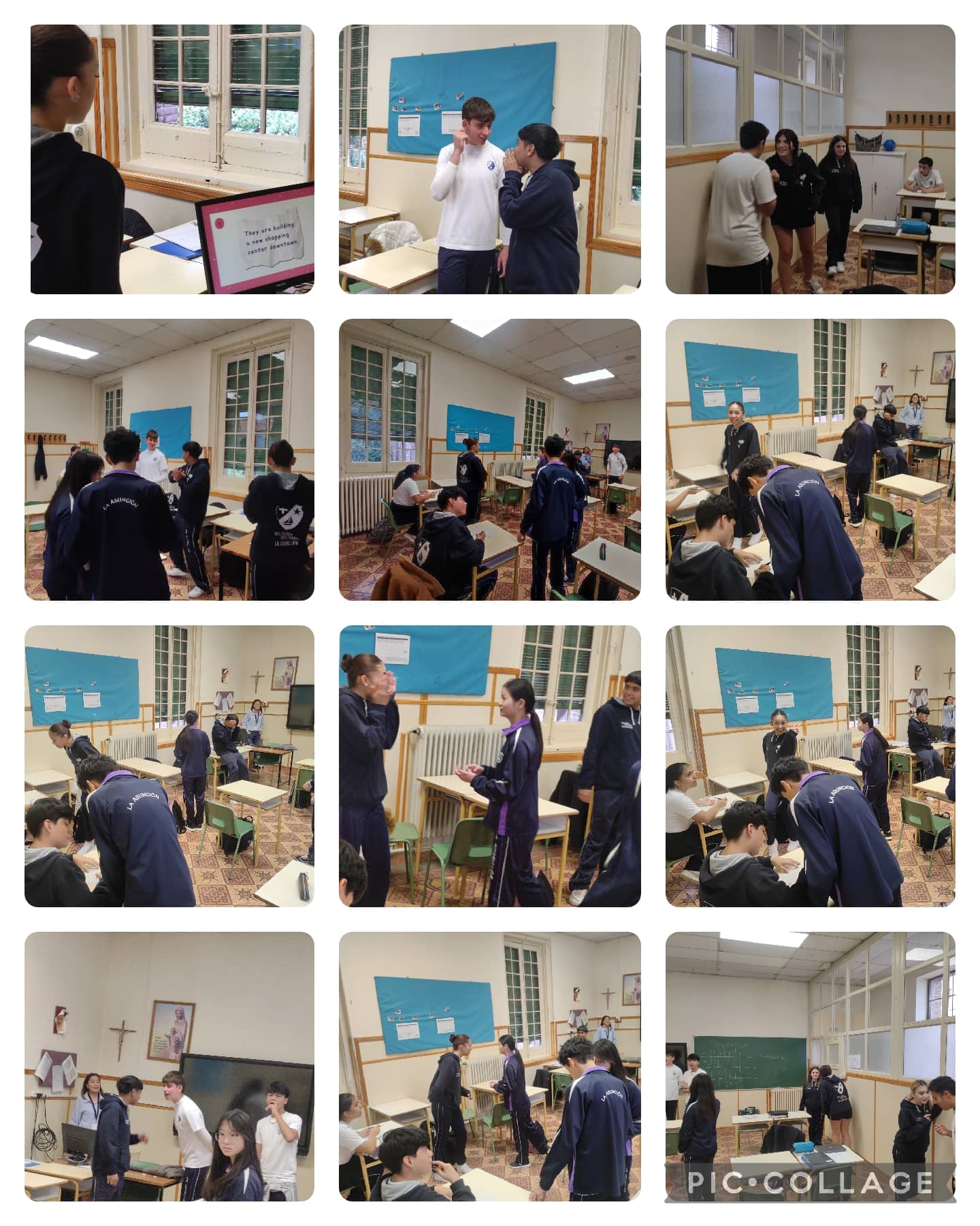 Cuando nos toca con el auxiliar, las clases de Inglés nos rompen la rutina. Hoy en 4º de la ESO nos hemos levantado del pupitre para jugar al tradicional teléfono escacharrado, pero en inglés. En grupos de 4 o 5 compañeros, nos hemos pasado mensajes. El primero del equipo leía en la pantalla una frase y tenía que pasar el mensaje al siguiente y éste al siguiente, y así, hasta que llegara al "escriba" que tomaba nota de lo que hubiera entendido. Es una manera de trabajar diversas habilidades del idioma, el listening, el speaking, el writing y también de activar el trabajo en equipo. Los alumnos se han implicado con mucho interés en la actividad y han trabajado muy bien, por eso, teníamos también que "pasar el mensaje".