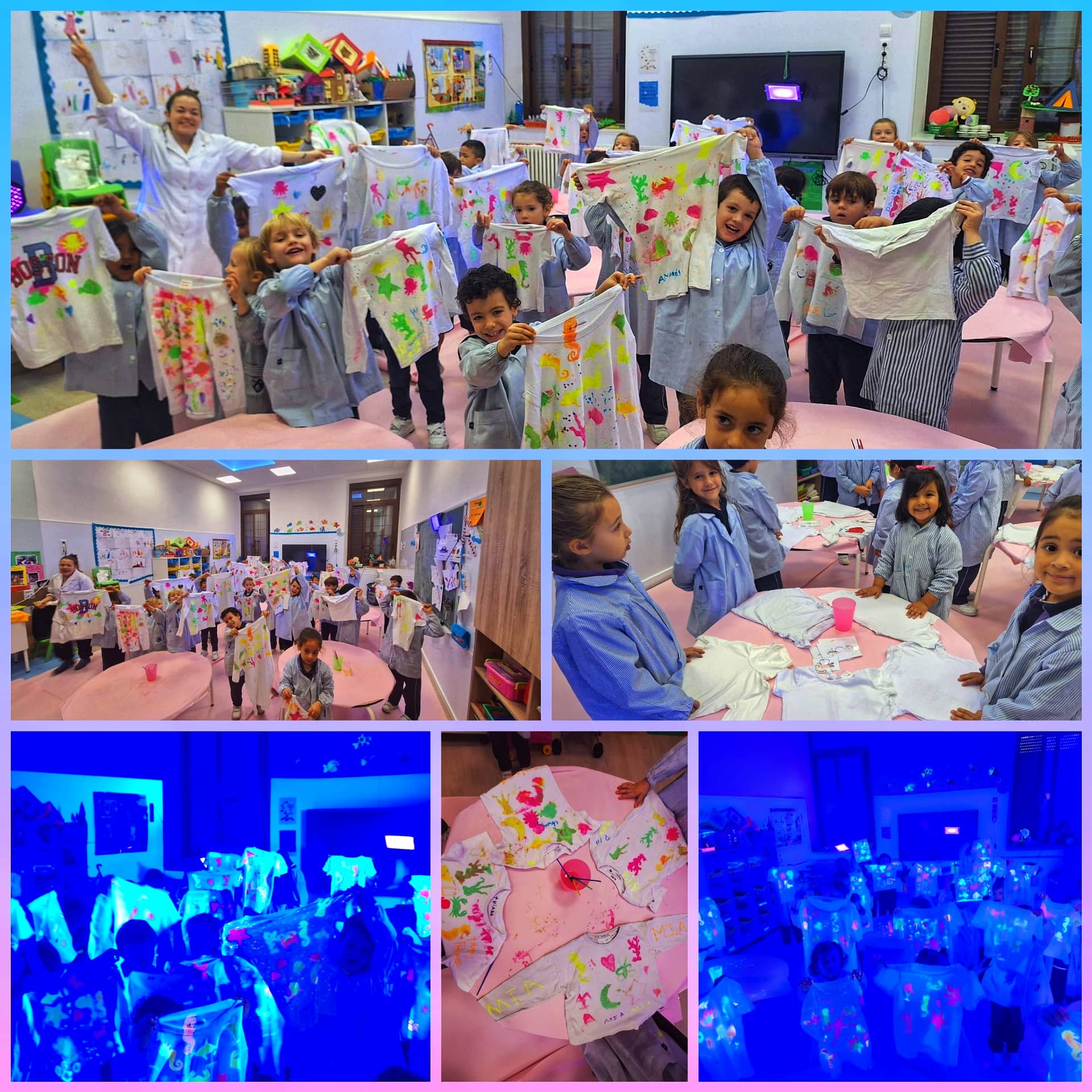 Además, una vez terminado el teatro, por grupos, nuestros alumnos han disfrutado de un taller sensorial de luz negra con pinturas fluorescentes, donde han podido plasmar en sus camisetas, muchos de los personajes del océano, creando una magnífica experiencia sensorial, donde la atención, el aprendizaje, la diversión, la magia y la sorpresa han estado presentes y donde todos los sentidos han estado involucrados y trabajados durante la actividad.
