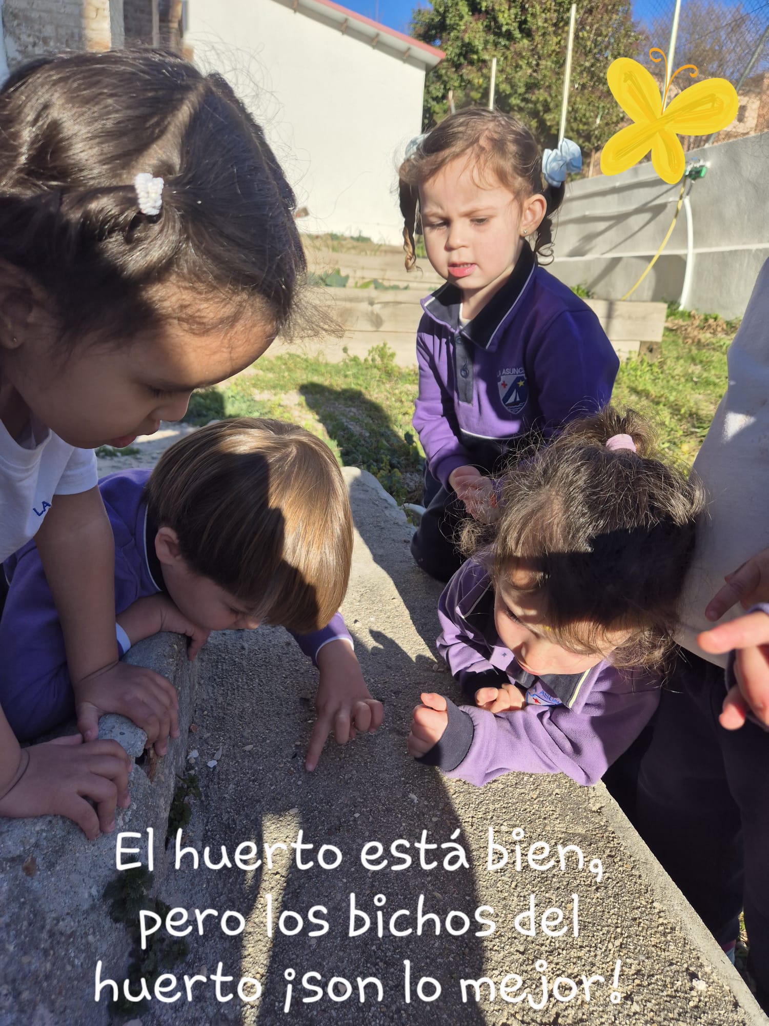 A nuestros pequeños de infantil, les encanta visitarlo y pasar tiempo allí. Preparar la arena y mancharse las manos, observar las verduras, sembrar las semillas, coger la manguera, saludar a los espantapájaros que nuestros compis mayores han preparado, o jugar con los insectos que nos vamos encontrando, son algunas de las cosas que más les gusta hacer y con las que más disfrutan.