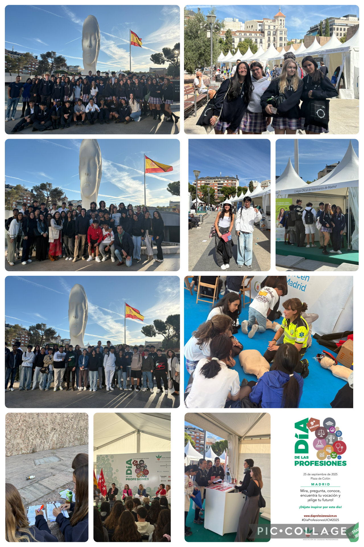 El pasado jueves 25 de septiembre, los alumnos de 4º ESO y 1º y 2º de Bachillerato asistieron a la 9ª Edición del Día de las profesiones, en la plaza Colón. Habíamos planeado trasladarnos hasta allí en transporte público pero, aprovechando la cercanía y la buena temperatura que nos está acompañando hasta el fin del mes de septiembre, fuimos a pie. No solo disfrutamos del precioso paseo hasta allí, sino que al llegar, pudimos elegir entre una gran variedad de talleres ofrecidos por los distintos colegios profesionales y recoger información en los distintos stands de la mayoría de las universidades de Madrid.