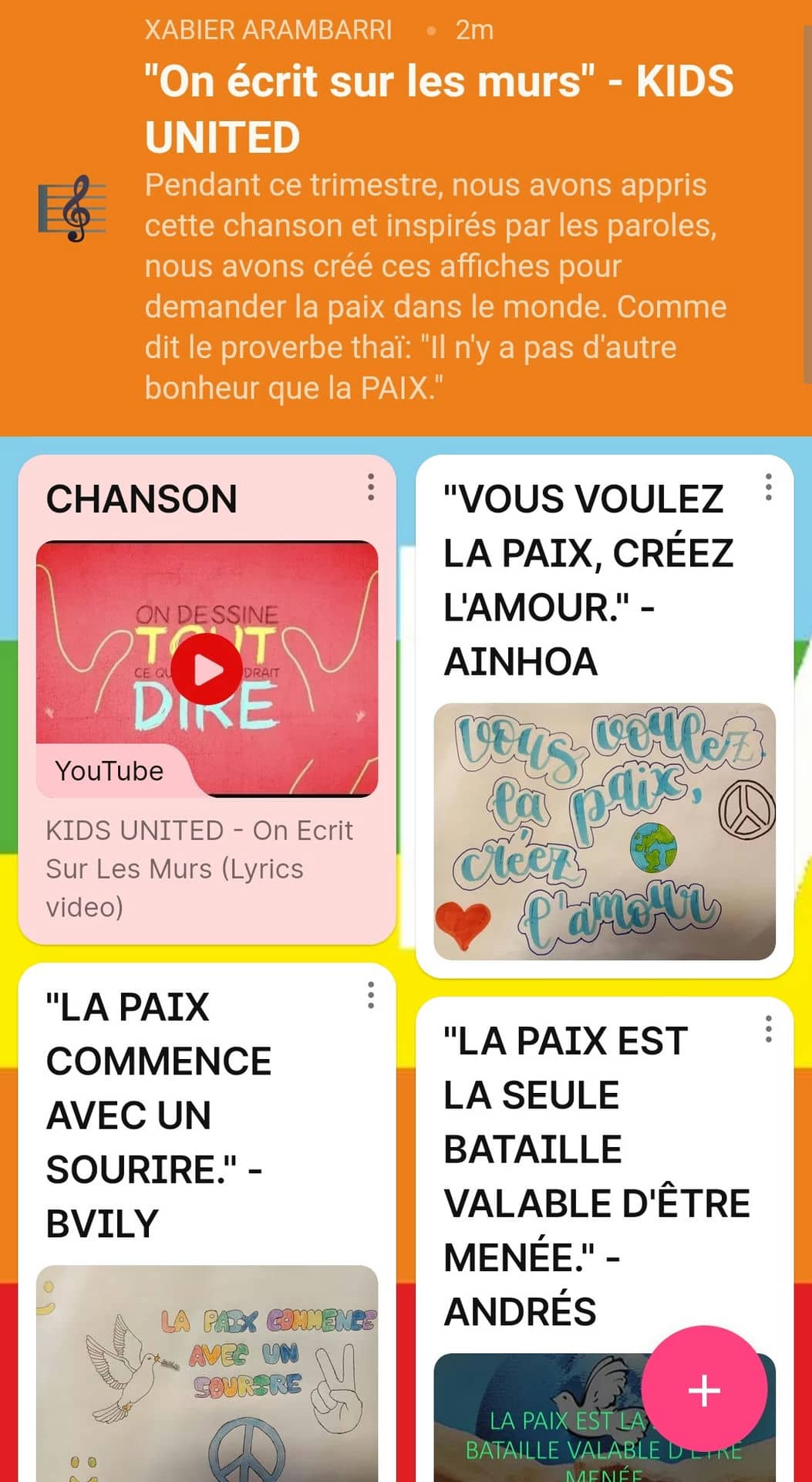 Durante este trimestre, en 1º de la ESO, hemos aprendido la canción On écrit sur les murs de United Kids. Inspirándose en la letra de la canción, los alumnos han creado carteles pidiendo PAZ en el mundo. ¡Realmente la necesitamos...! En este link, podéis descubrir todos los pósters: https://padlet.com/xarambarri/4mix5n87exjp