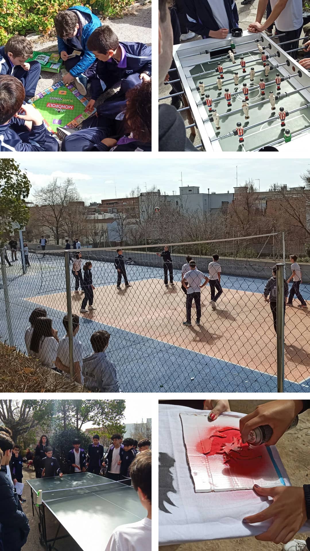 La mañana de la fiesta de Sª Mª Eugenia es sinónimo de alegría y deporte. Tras tomar la palmera, nos lanzamos a jugar a los talleres que han coordinado los alumnos de 2º Bachillerato. Fotografía, relatos, juegos de mesa, camisetas, ping-pong, volley, baloncesto, ... En cualquier rincón había una oportunidad de disfrutar y pasar un muy buen rato.