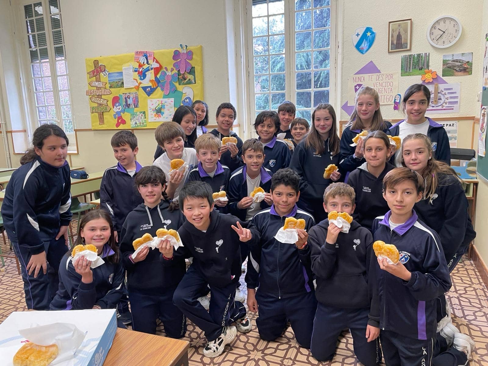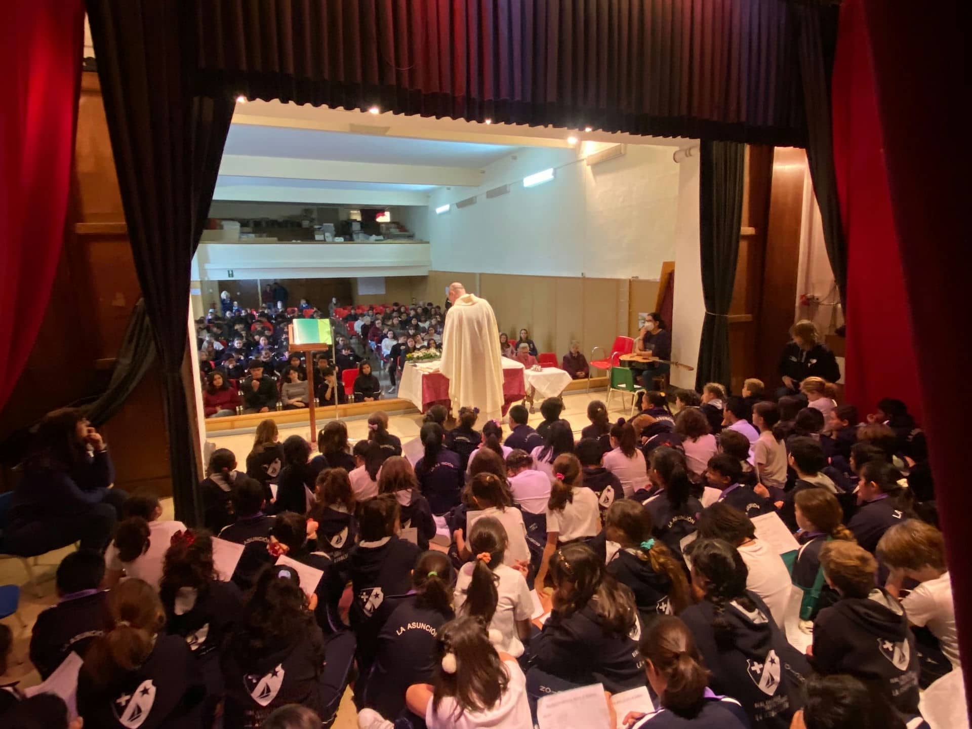 Por una parte, al no caber todos en el salón de actos, las clases de 1º a 4º de Primaria y de la ESO tuvieron una Celebración de la Palabra hermanándose pequeños y mayores. Las aulas se convirtieron en lugar de comunión y oración conjunta, una oportunidad de reunirnos mayores y pequeños.