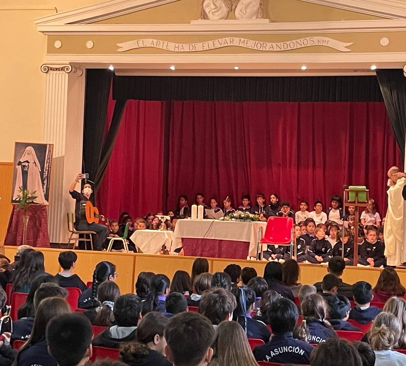 El salón de actos se convirtió en un salón de encuentro de los alumnos de 5º y 6º de Primaria y Bachillerato. Tuvimos la Eucaristía, acción de gracias por la vida de Mª Eugenia y por el Colegio. Presididos por Ángel Langa (párroco de la cercana Nª Sª de las Angustias) y animados por el coro del Colegio, pudimos dar gracias a Dios por tanto don recibido...