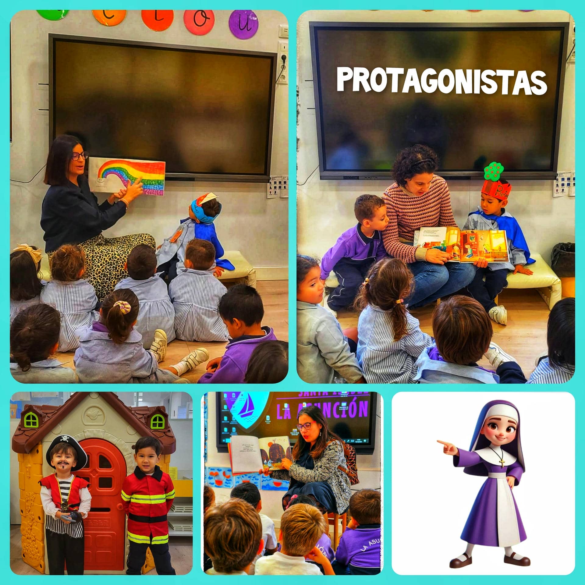 Cada semana, un alumno/a de cada clase, es elegido protagonista, y es el encargado de ayudar, de colaborar, de traer al cole algunas cosas especiales para él/ella que hagan que el resto de sus compañeros/as le conozcan un poquito más. Es bonito ver cómo expresan sus gustos, sus preferencias, cómo presentan a sus familias, cómo ayudan a la profe y cómo se sienten todavía más importantes durante esos días. Además, al ser una semana especial, sus familiares pueden venir a la clase a contarnos un cuento o a realizar una actividad que les ayude con la lectoescritura y que fomente el gusto por la lectura. Queremos agradecer su colaboración, ya que sin ellos, la actividad no sería igual.